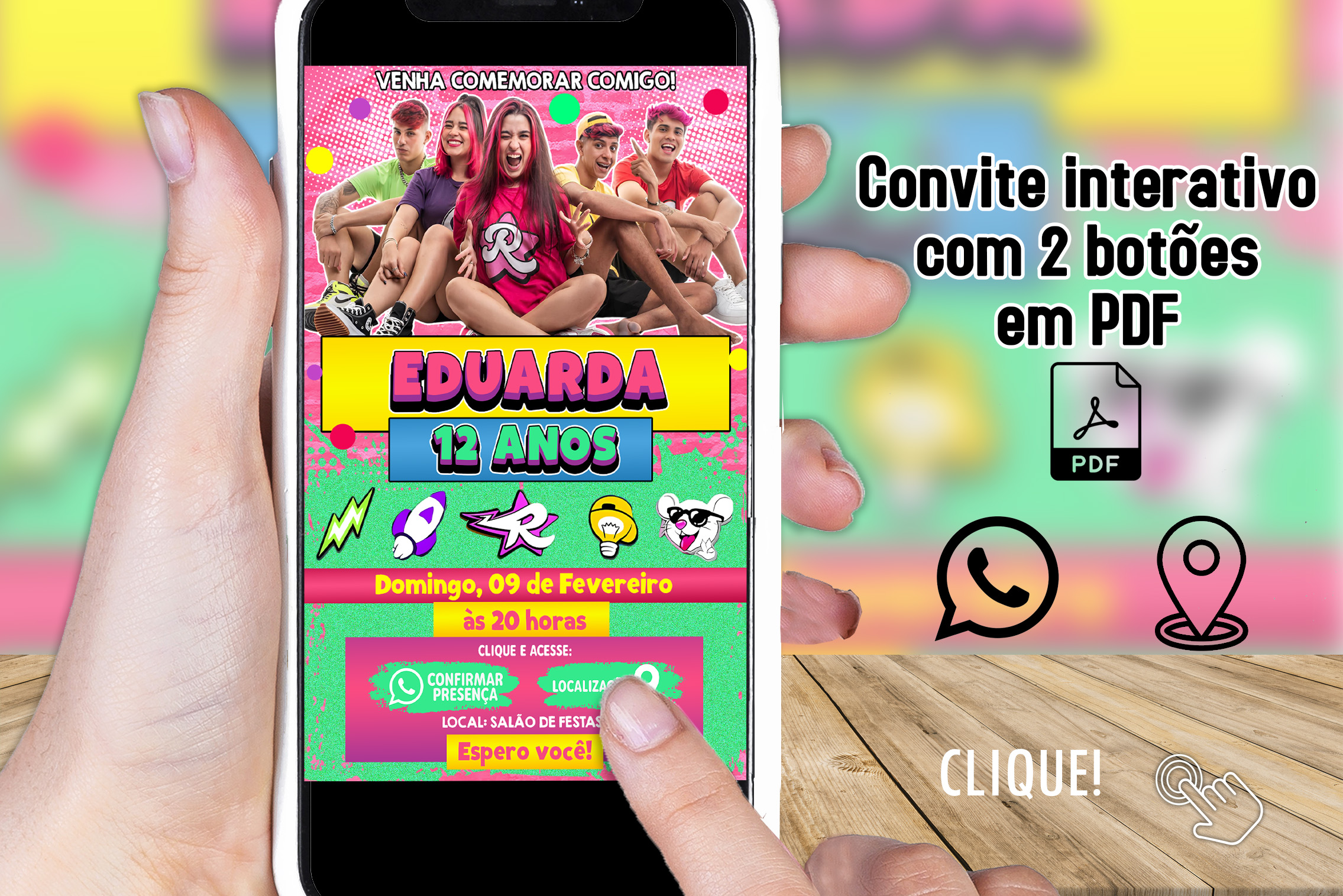 Convite Digital Interativo Dos Rosa Emilly Vick com Botões Clicáveis