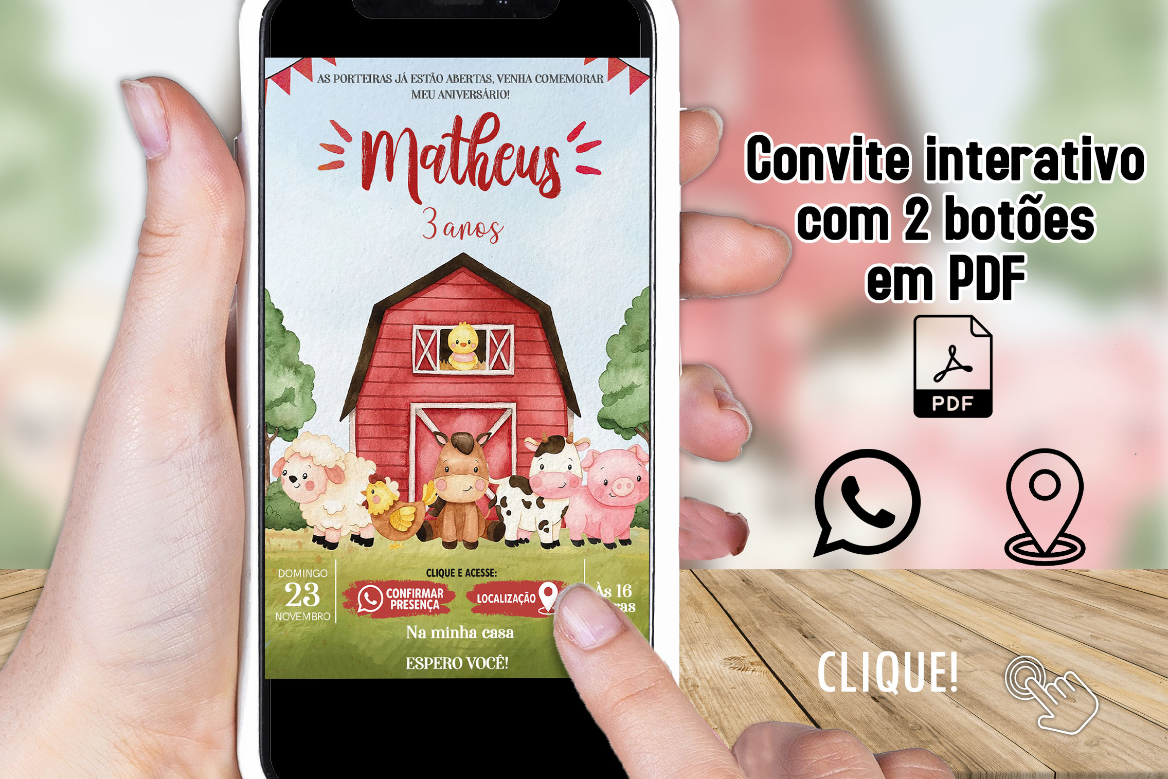 Convite Digital Interativo Fazendinha em PDF com Botões Clicáveis
