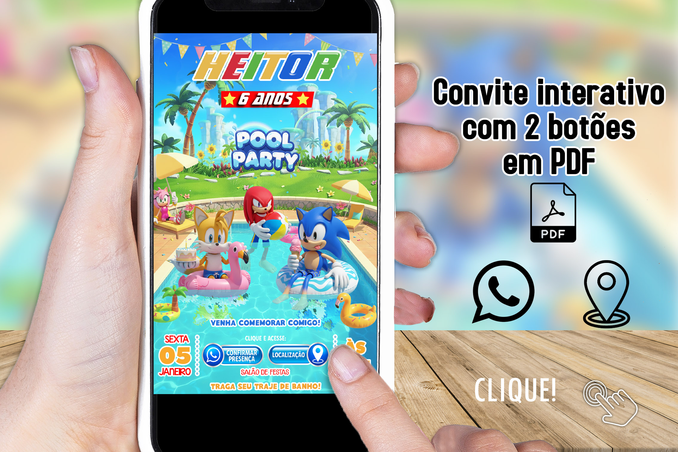 Convite Digital Interativo Sonic Pool Party em PDF com Botões Clicáveis